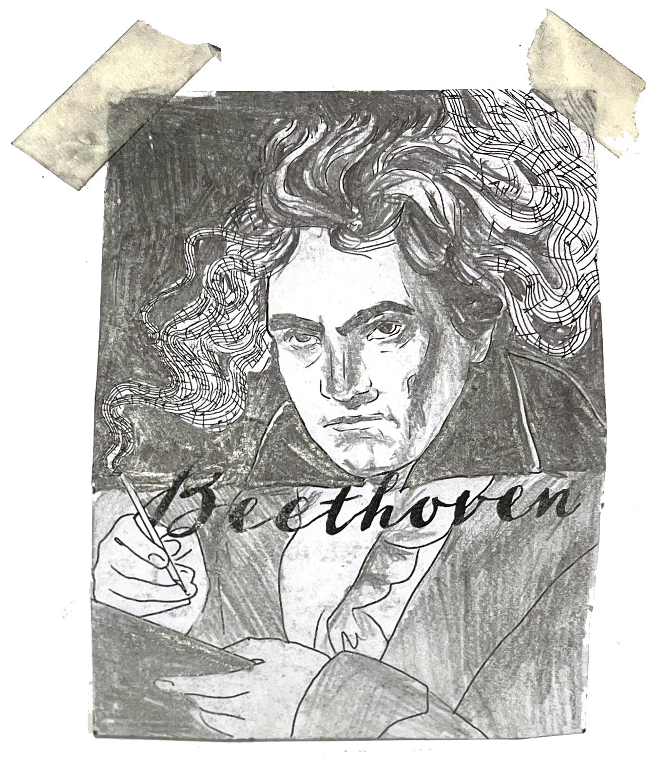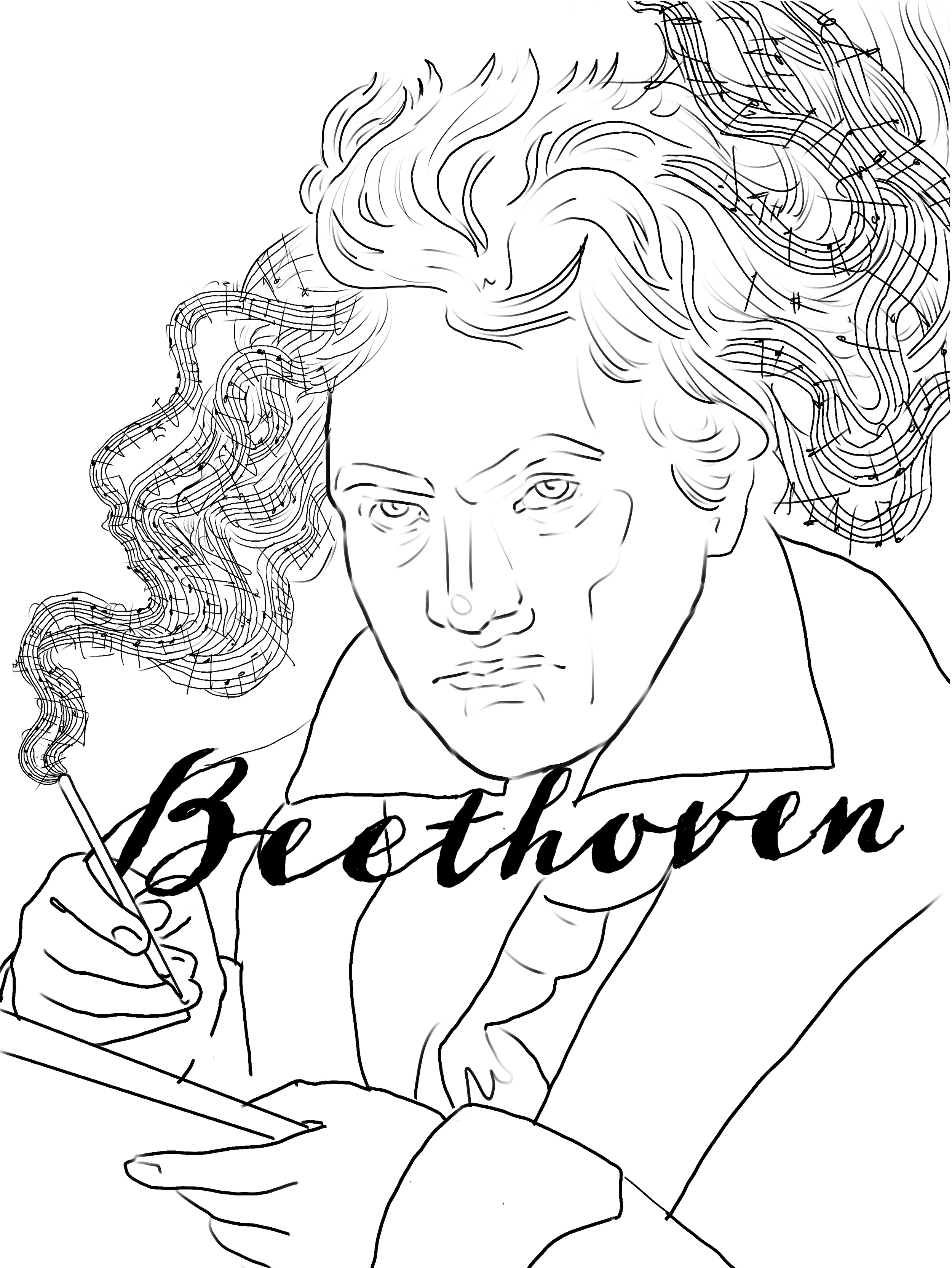 Given Beethoven's obsession with his art, I depicted his pen as if it were smoking, like he was writing so fast it was producing steam. The smoke spirals into his wild hair and transforms into musical notes, representing his intense connection to his compositions. From this, I created a base thumbnail digitally.