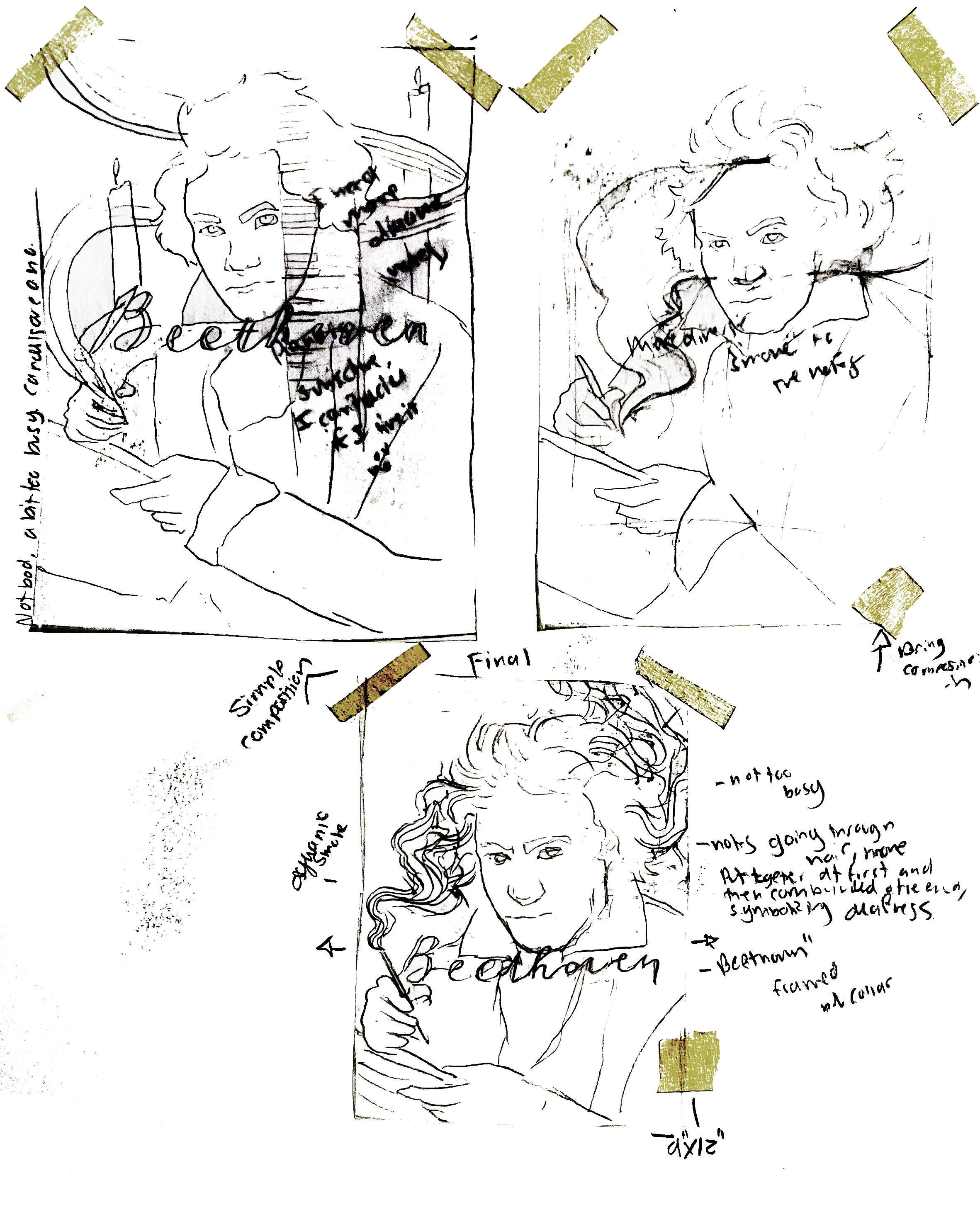 For this Beethoven portrait, I wanted to incorporate various elements that reflect his life. I began with thumbnail sketches to explore ideas and figure out how to best represent them. As I often mistakenly do, my initial ideas turned out to be too busy.