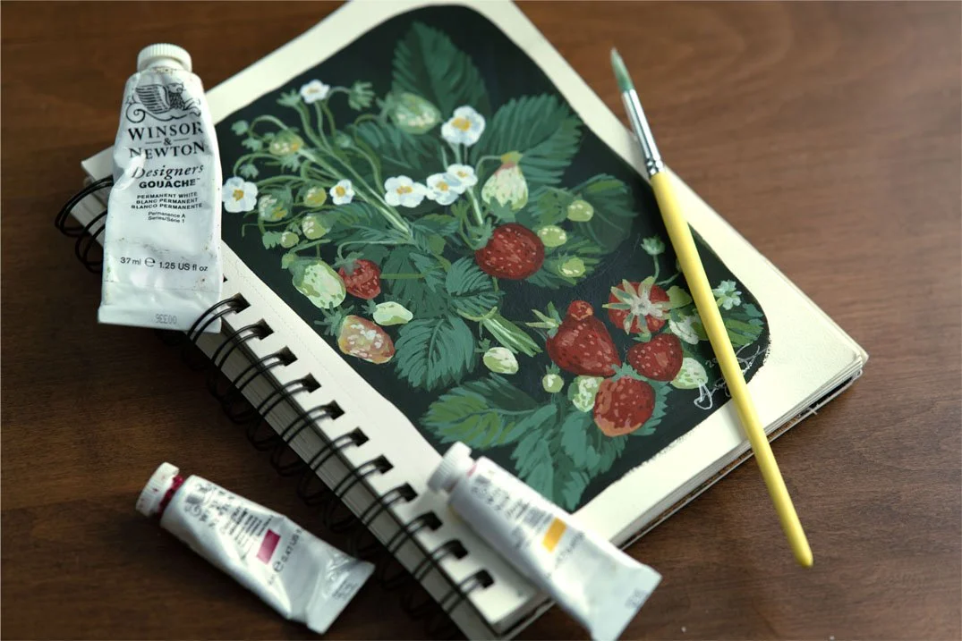 This sketchbook study explores a slightly different approach to gouache, focusing on layered opacity, brush economy, and deeper value contrast. Working quickly and intuitively, I used the subject of wild strawberries to experiment with texture, color temperature, and mark-making, allowing the process itself to guide the final composition.