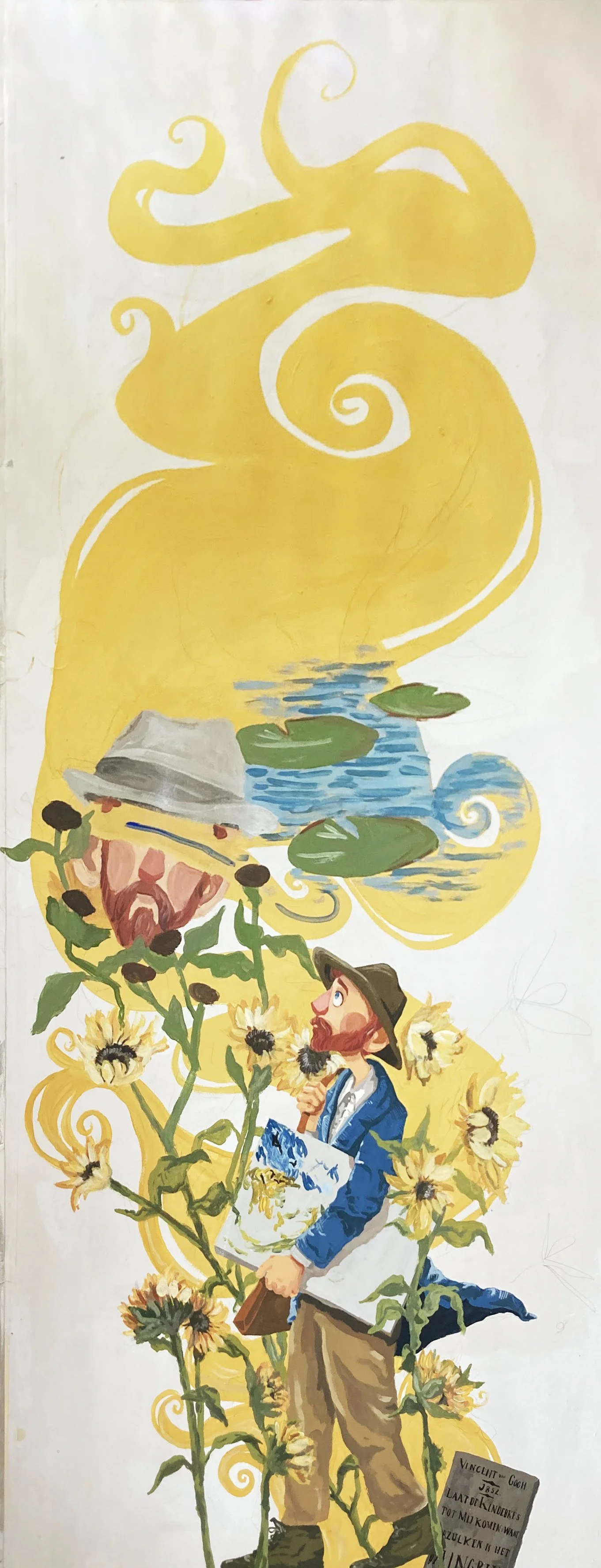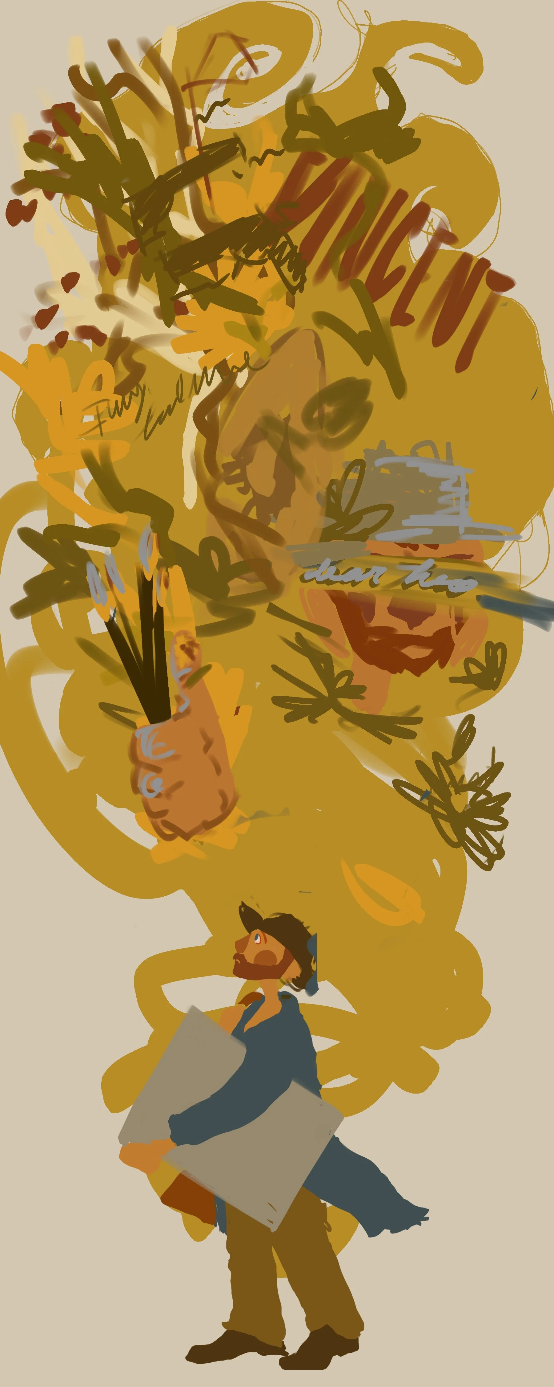 After exploring the life of Vincent Van Gogh, I was inspired to create an artwork that reflects his compelling story. Capturing his deep emotions, I designed a central figure surrounded by elements from his paintings, guiding the viewer through key moments of his life. From his close bond with his brother Theo to his admiration for the book Uncle Tom’s Cabin, this piece is rich with symbolic details drawn from throughout his journey.