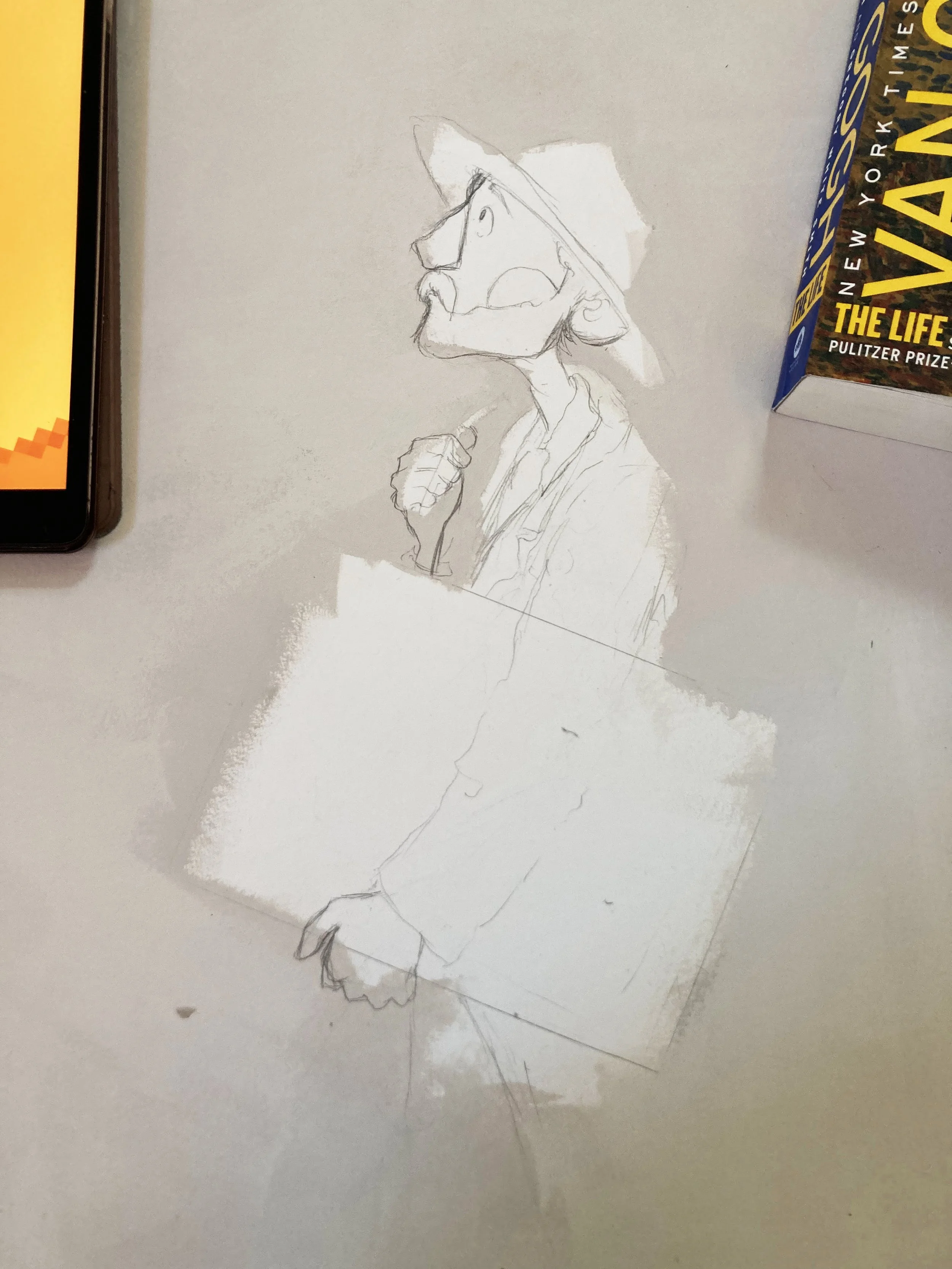 I didn’t have a clear idea of the final composition at this stage. Normally, by this point, I have a better sense of where the painting is headed, but for this piece, I felt the need to begin even without a fully developed concept. At this point, I began a general sketch of Vincent and filled in the background with a neutral color.