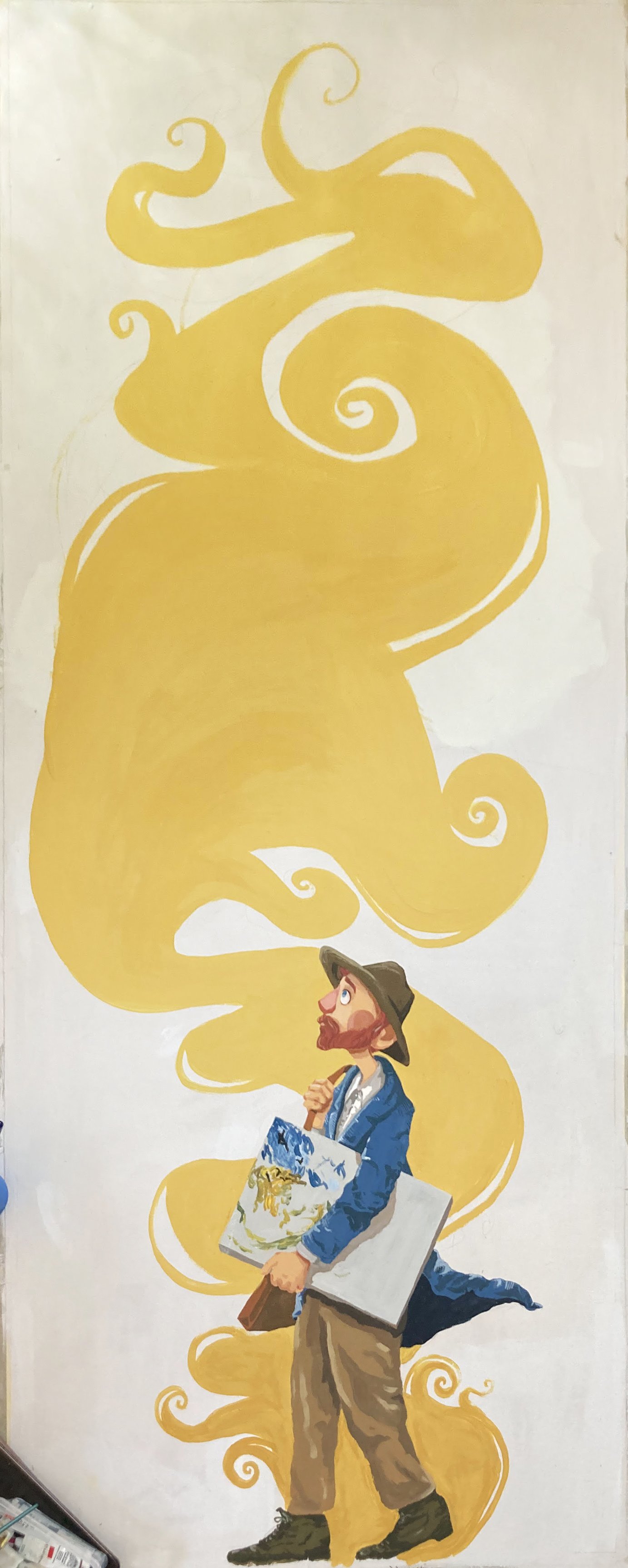 Next, I added the yellow swirl base and began applying the initial colors to the canvas, starting with Vincent’s attire.