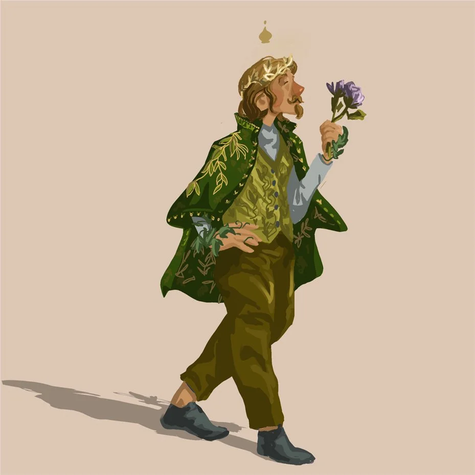 Day Three is when God created the earth. To represent this, I chose green as the dominant color and adorned Ratcliffe’s coat and vest with leaf patterns. He wears a crown of golden leaves and holds a purple rose, symbolizing life and beauty.