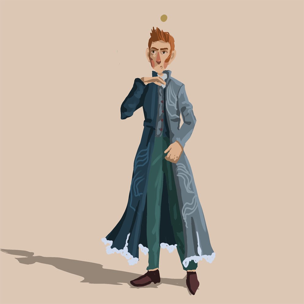 Day Two of Creation is when God created the expanse of waters, separating the different waters. I designed Gogol’s outfit with layers of blue, incorporating ocean wave patterns, to represent the separation of the various waters that were created.