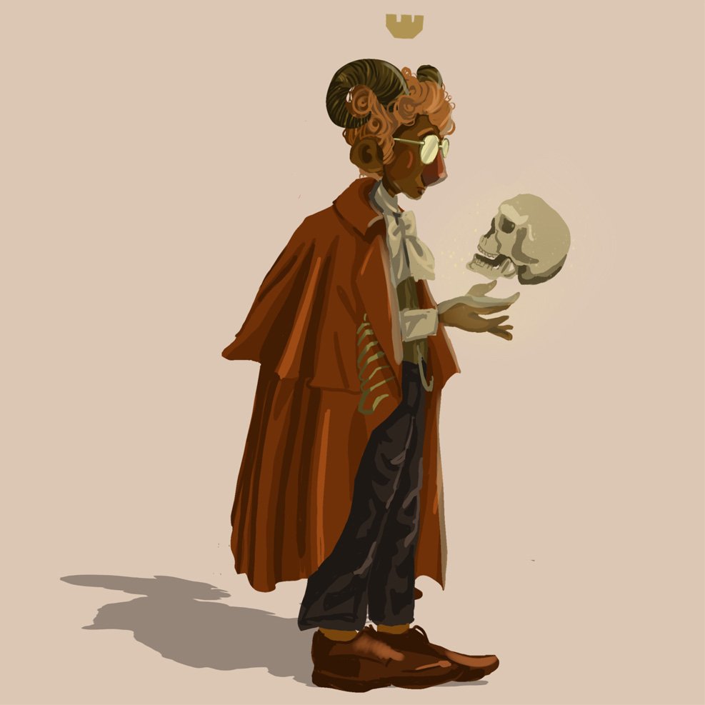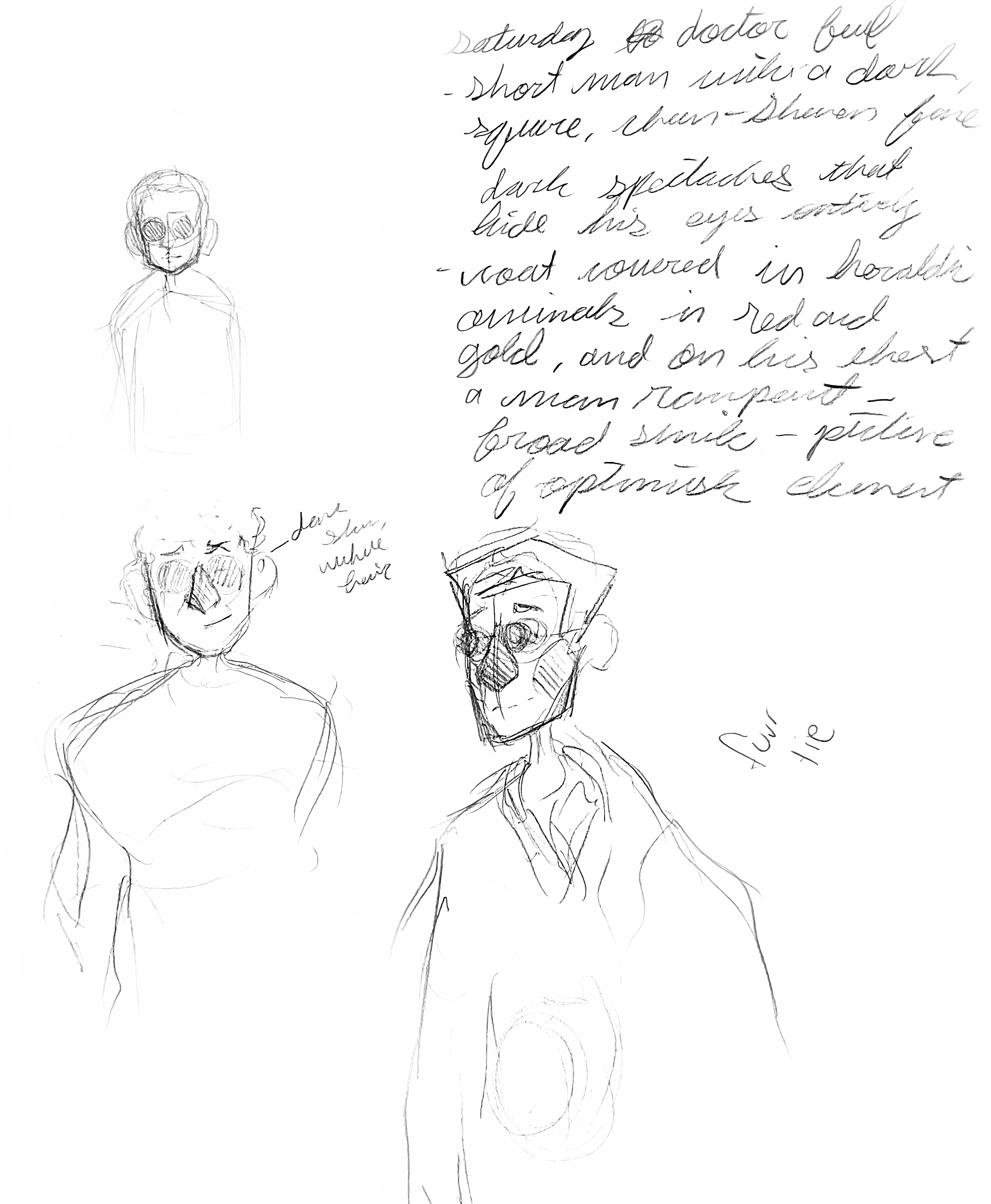 Dr. Bull’s coat, now, has details of a ribcage, representing death, while holding a skill. His glasses obscure his face as if to hide from the shame that sin brings.