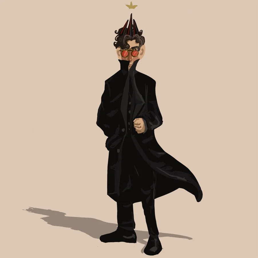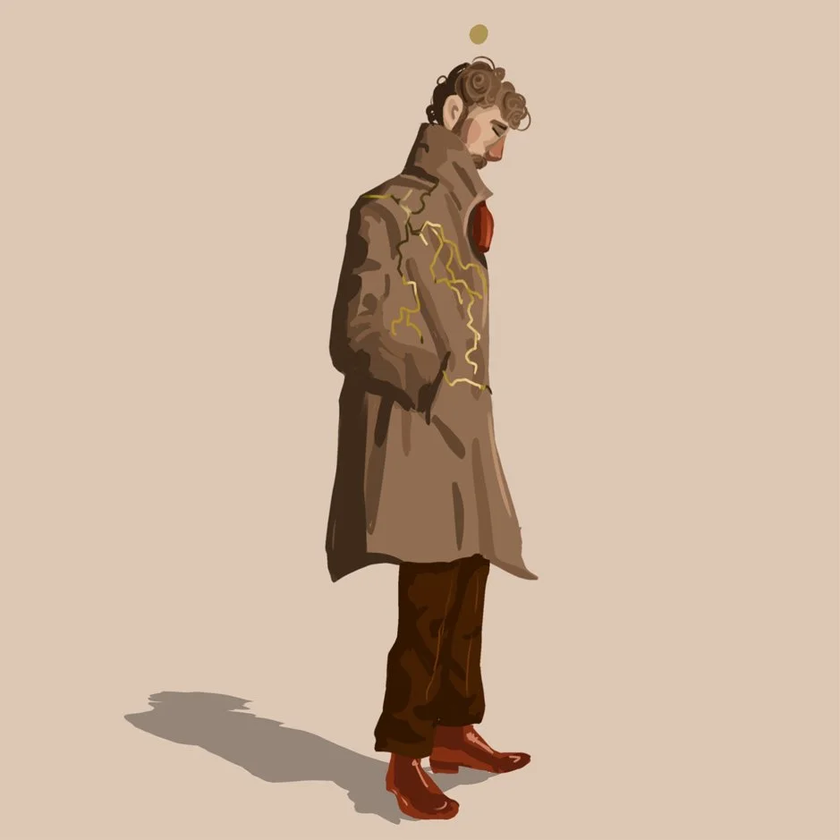 For this piece, I aimed to show how darkness distorts the light. The Secretary is depicted with his face partially obscured by the collar of his trench coat, wearing glasses that further conceal his features. This symbolizes the shame brought on by darkness. Additionally, he is seen attempting to hold his coat closed, as though he wants the dark coat to shield him and hide him from the light.