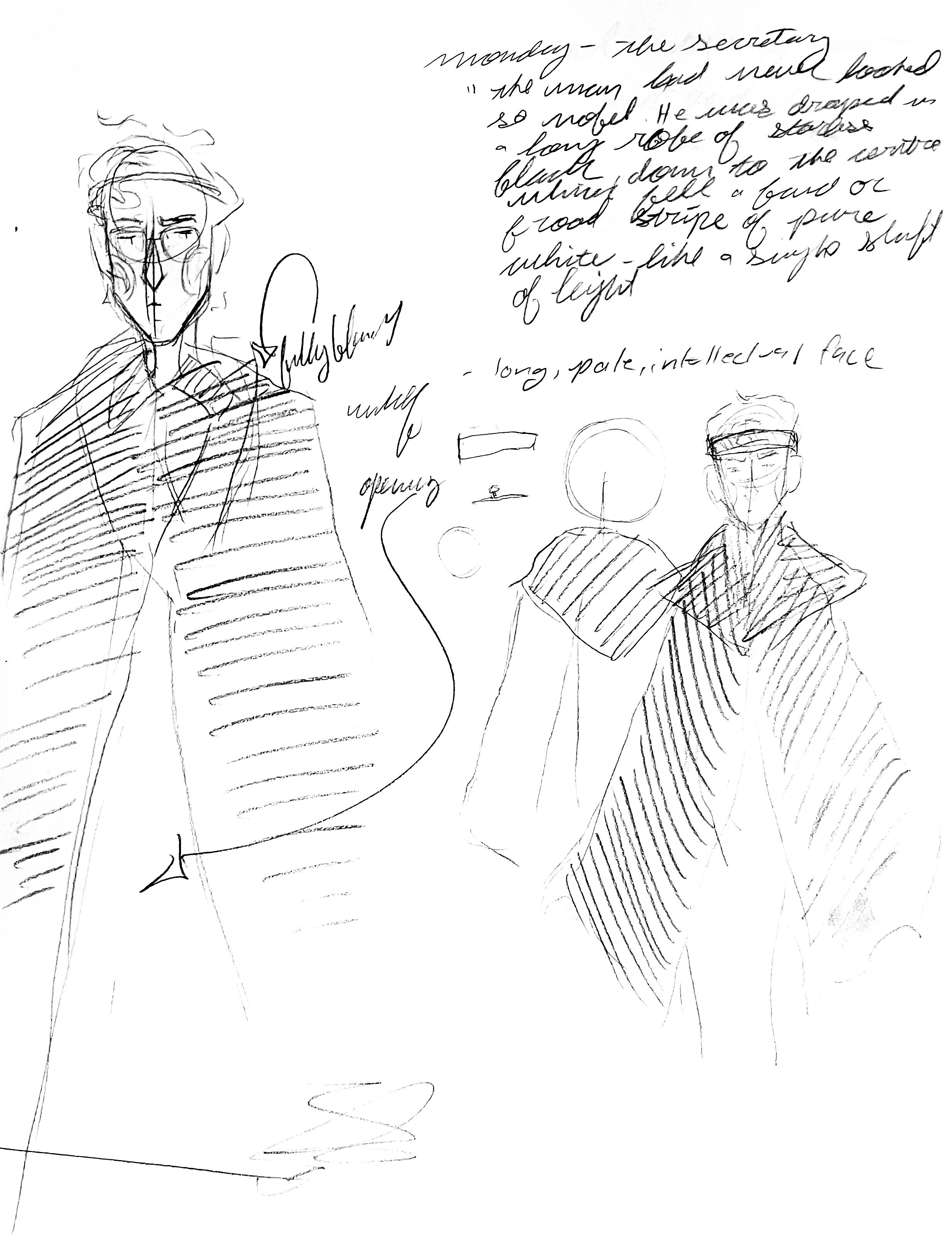 Day One of Creation focuses on the creation of light, where God separates the light from the darkness. For the Secretary, I designed a dark trenchcoat that represents the darkness. It splits down the middle to reveal light-colored pants underneath, symbolizing the creation of light and its separation from darkness.