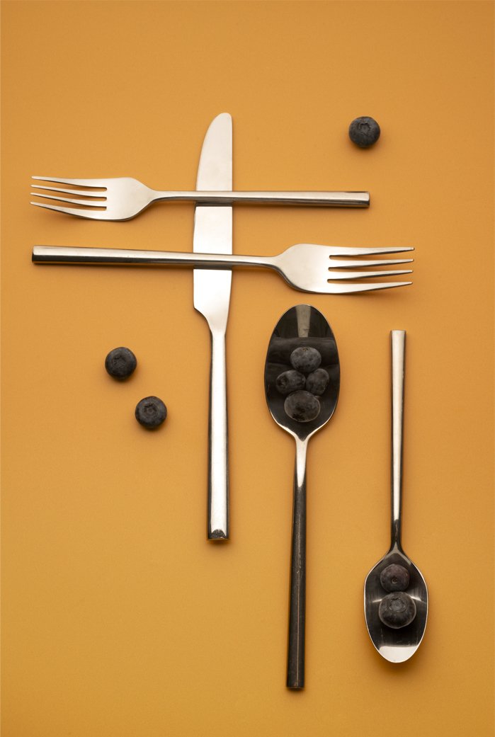 Next, I aimed to create a lifestyle shot that could be seen in a journal or an advertisement. I designed a unique composition using the flatware and some blueberries, paired with an orange background for contrasting colors.