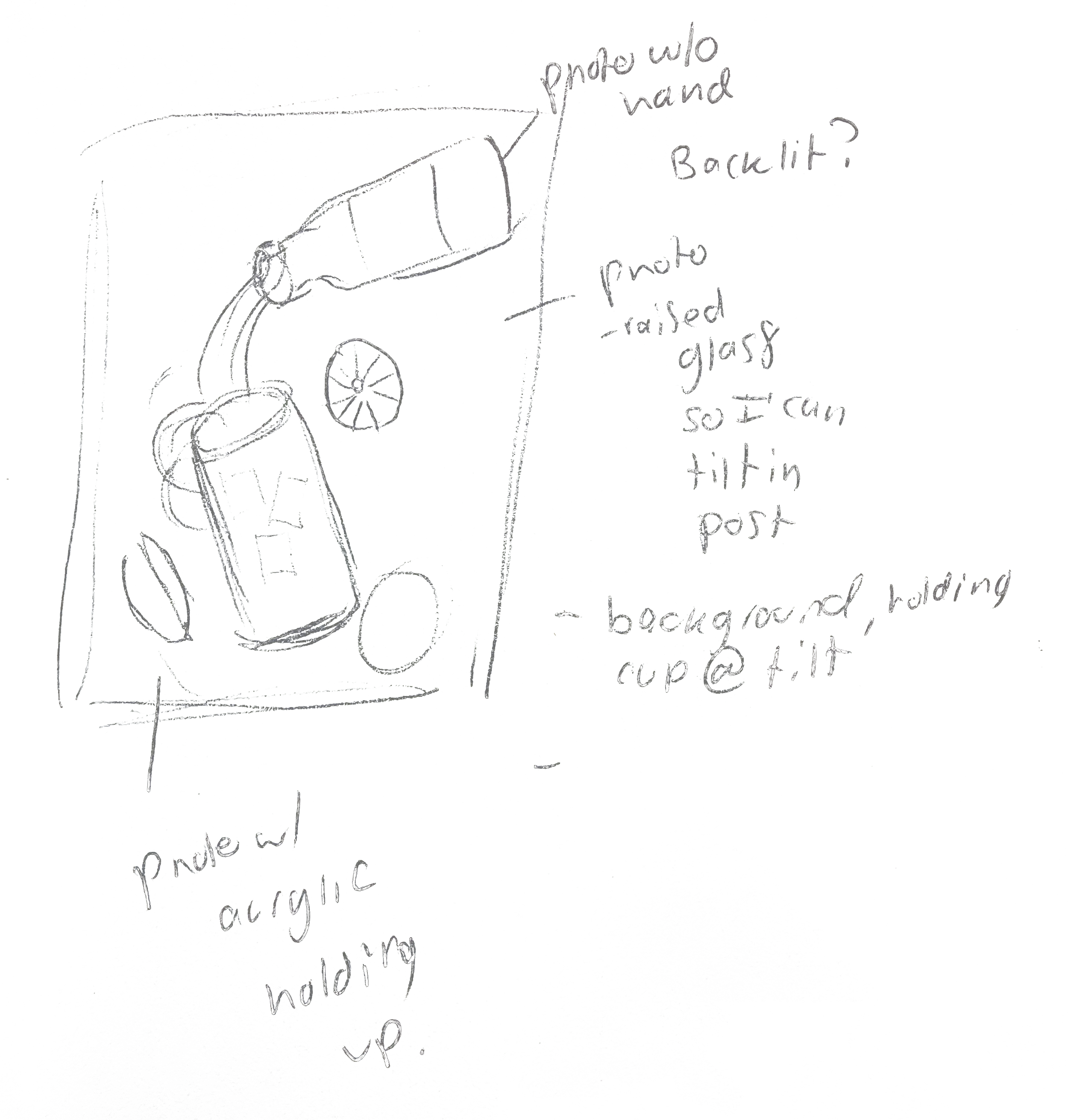 Some photoshoots are best done spontaneously, while others start best with a sketch. When creating a dynamic photoshoot with multiple elements, I find it best to begin with a sketch. When shooting the limeade bottle, I began with simple e-commerce shots leading into some lifestyle photos.