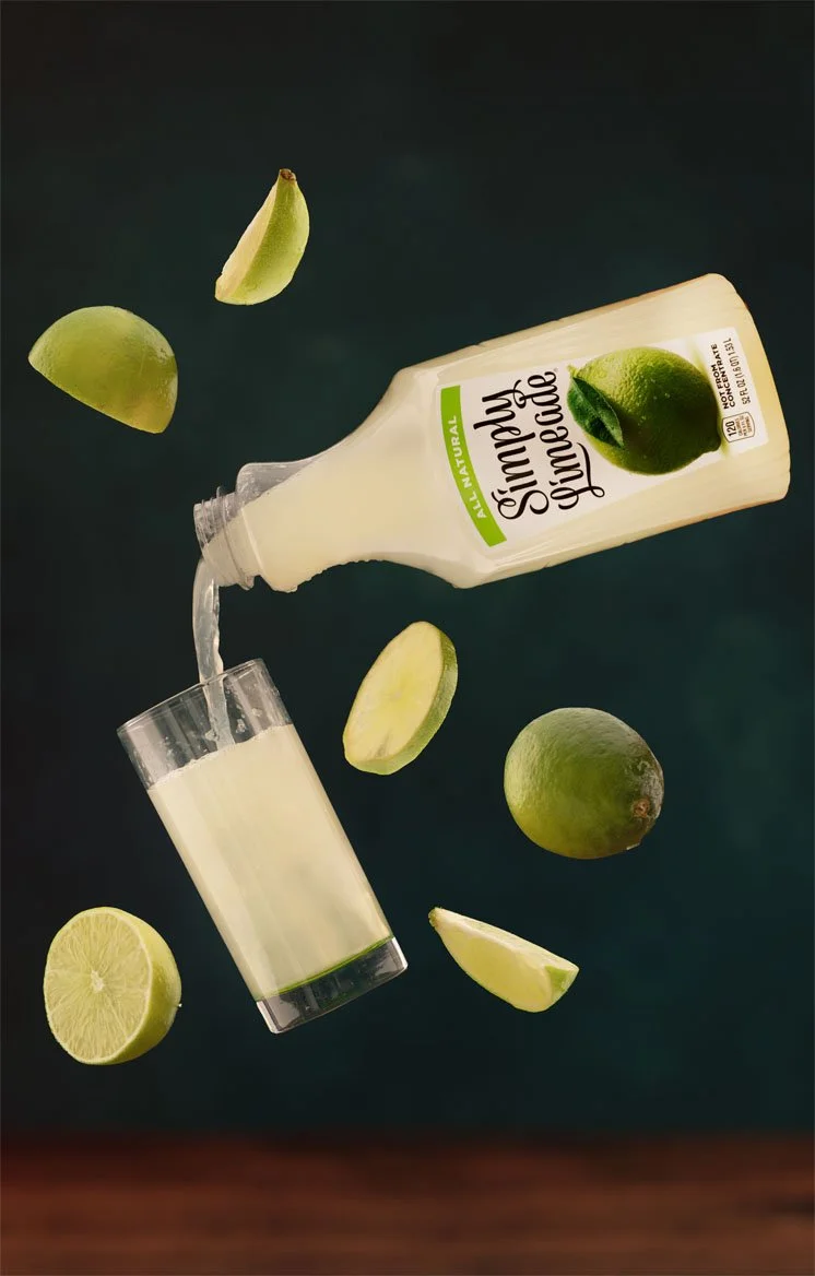 As you can see in the sketch, I wrote down each shot I needed to ensure I didn’t forget anything in the moment. The final image required over 10 shots. I wanted the bottle of limeade to appear as if it was being poured on its own, so I took several photos of me pouring it into the glass—some with a good stream of liquid, others where the bottle looked full, and many more, just to be safe. Even though the bottle would be emptier after pouring a full glass, it looks better if the bottle appears fuller. I also took photos of the cup placed on a block that could easily be removed in post-production, allowing me to tilt it for a more dynamic look. I originally planned to hold the lime slices on an acrylic stick, but quickly realized that was nearly impossible. After searching the studio, I found an X-Acto knife, which turned out to be the perfect solution for holding up the lime slices.