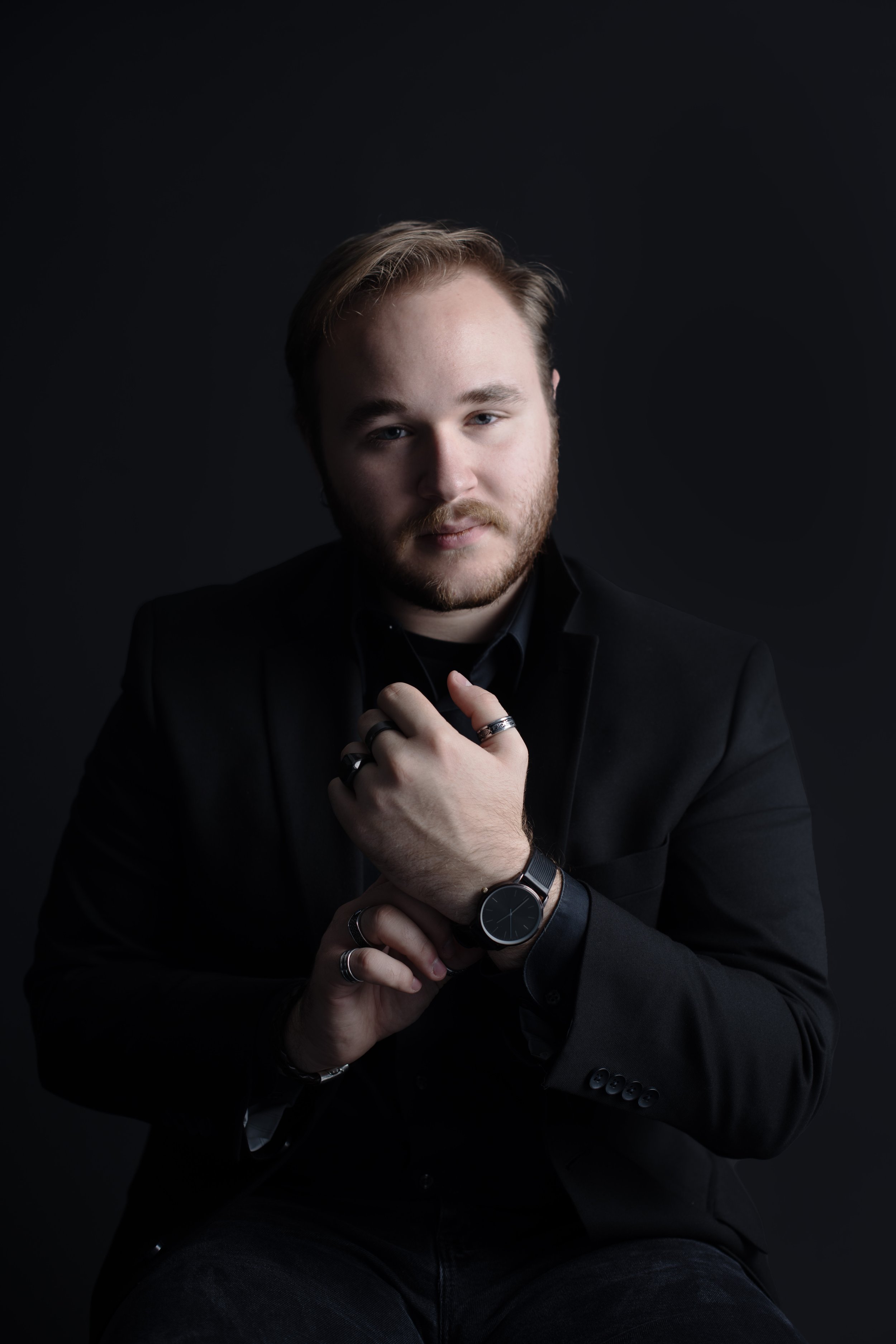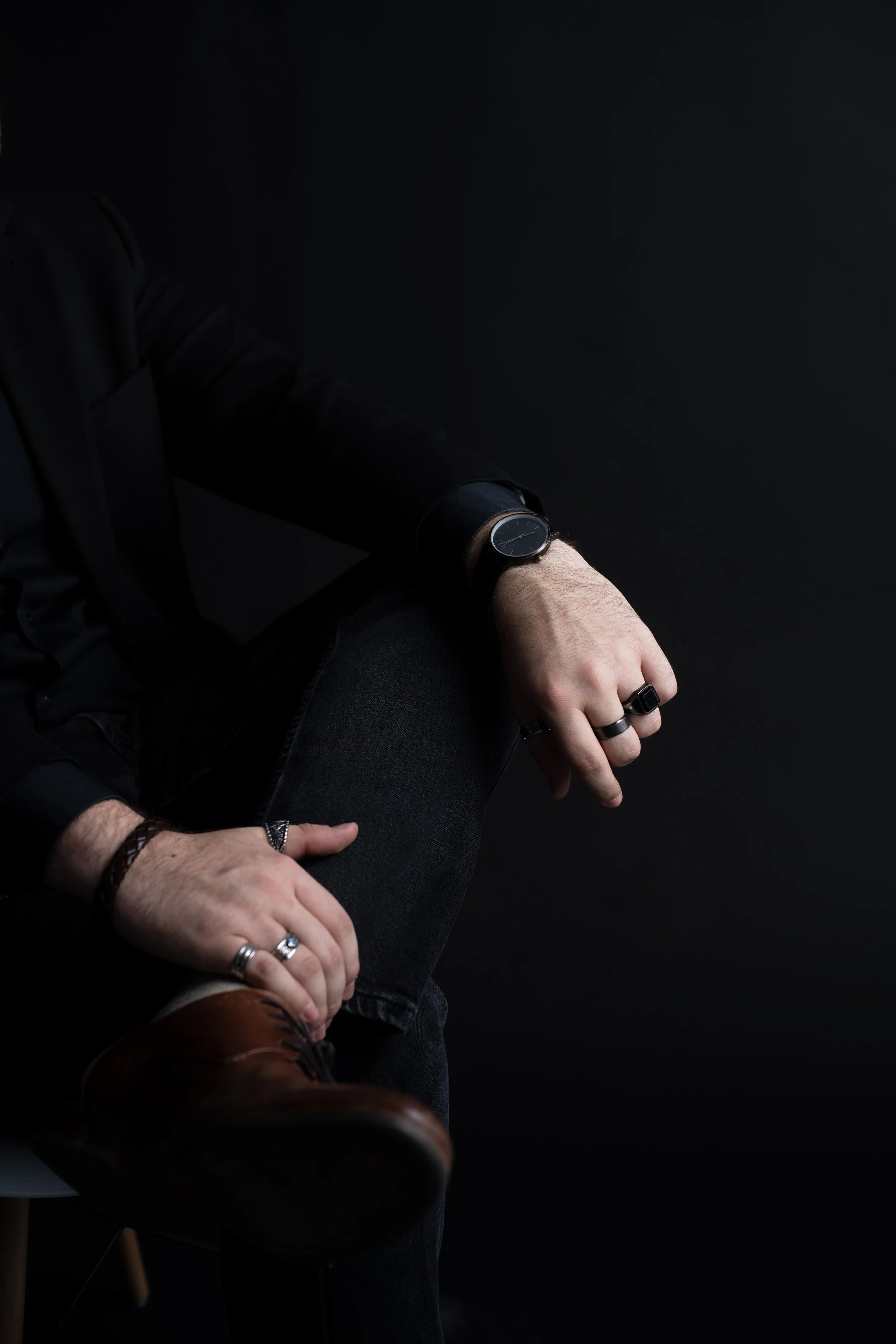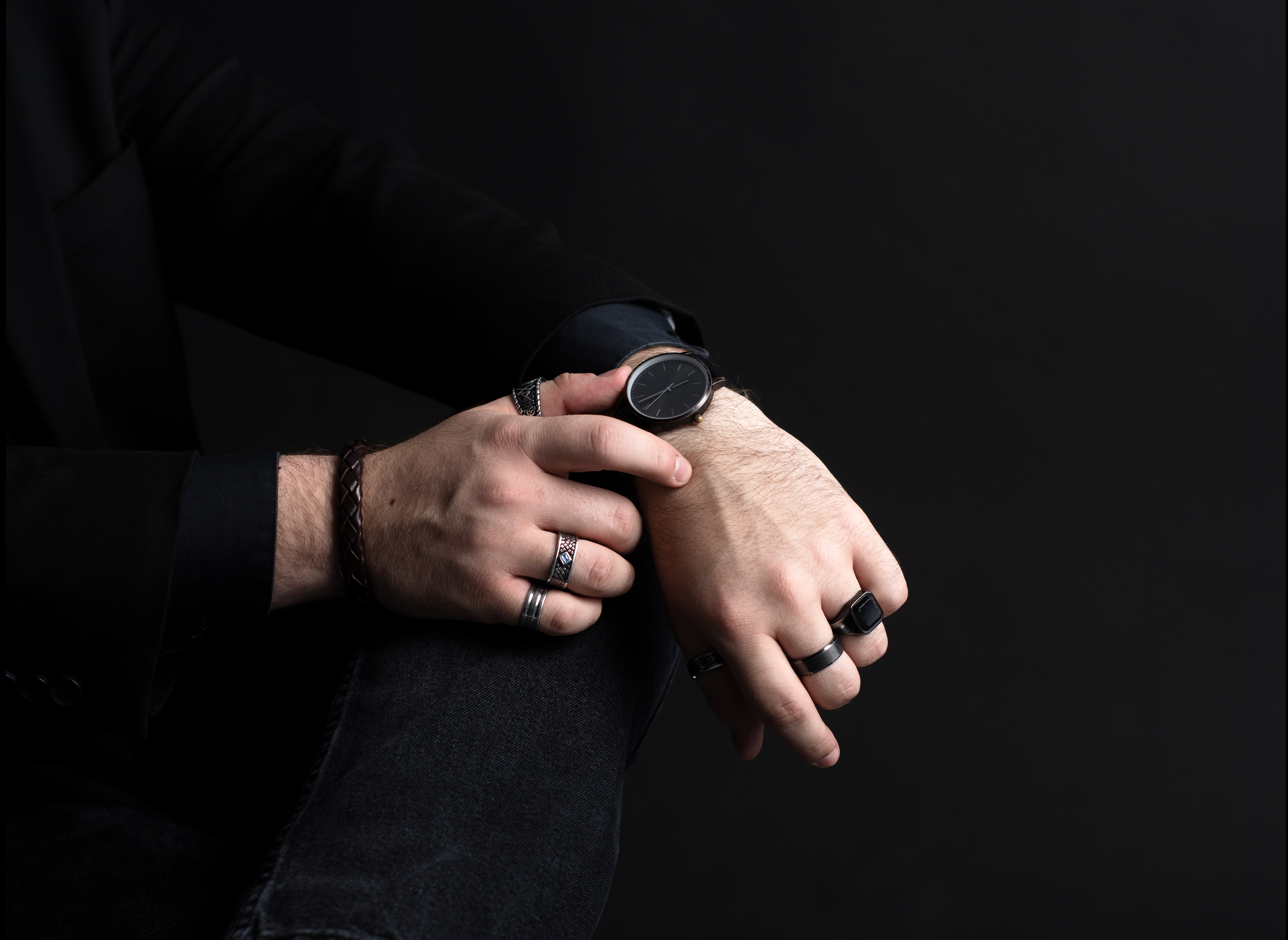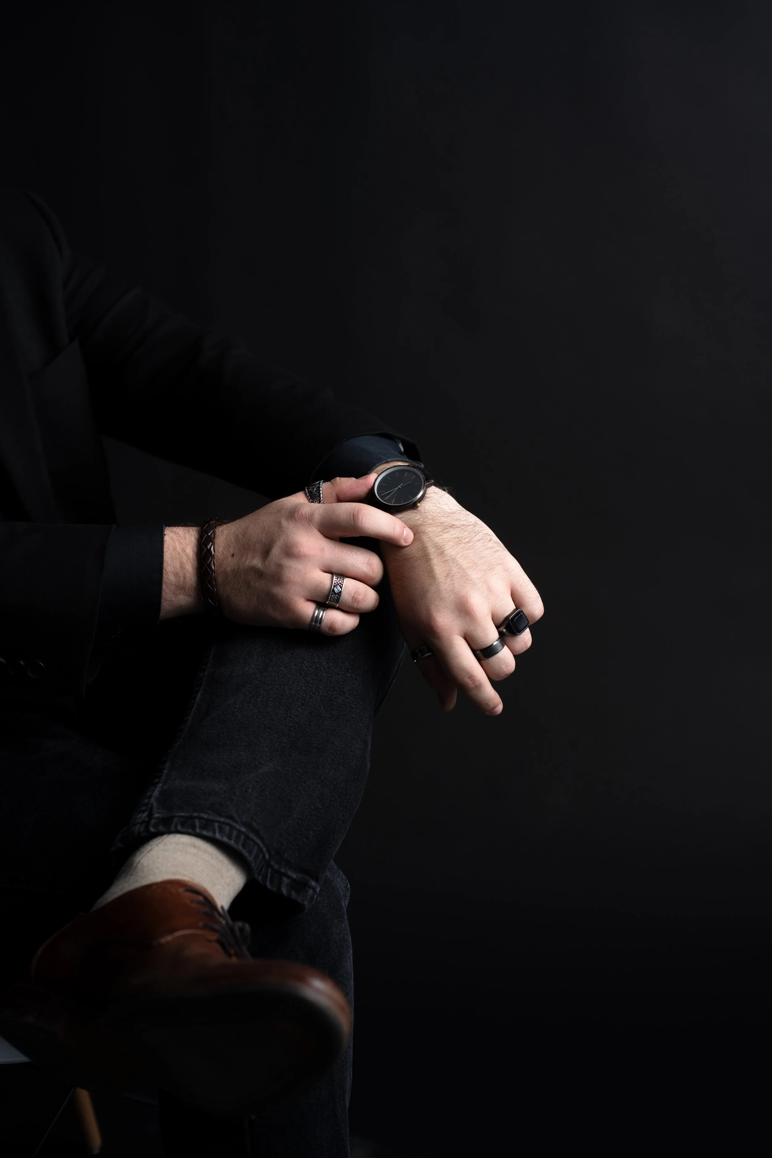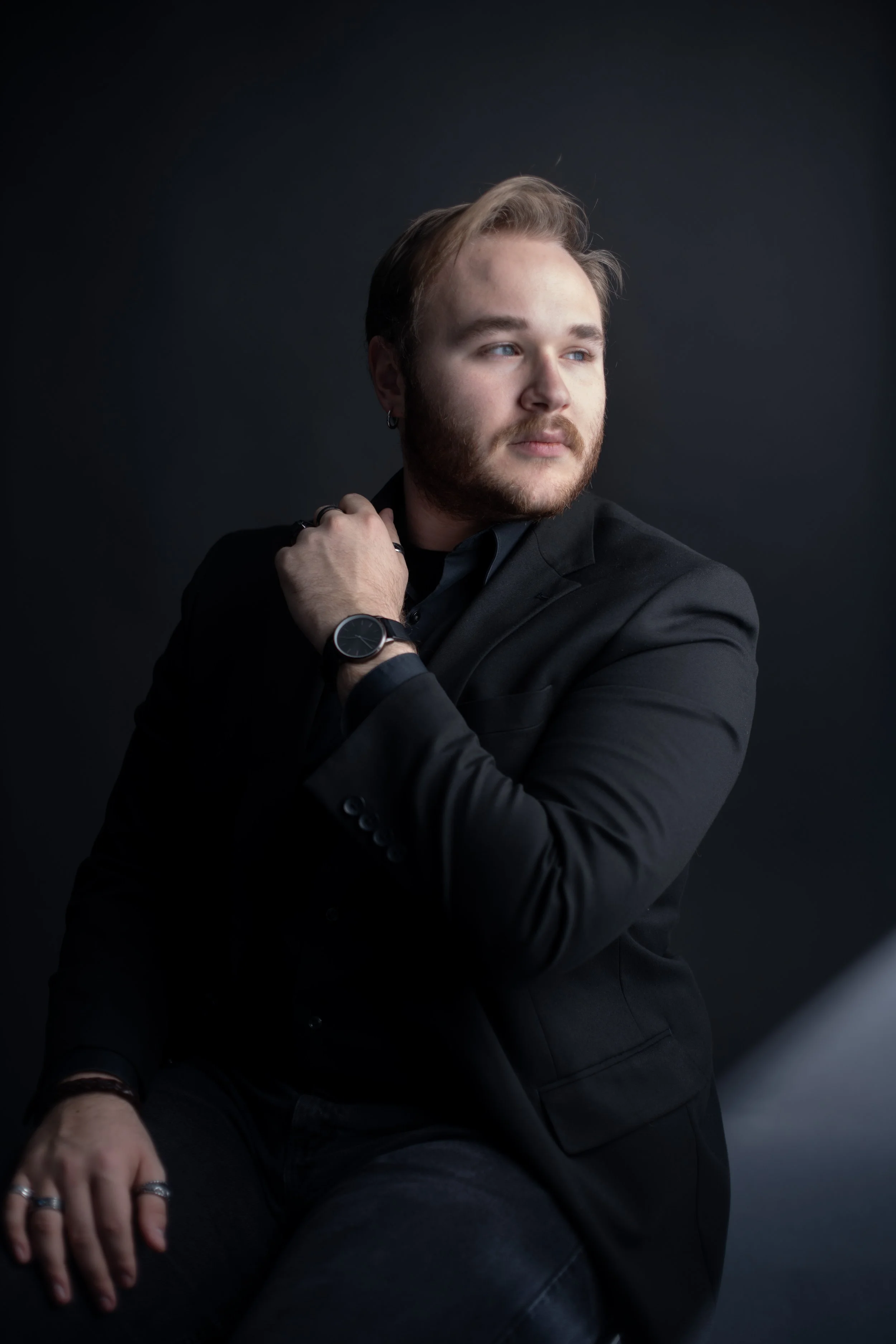 From there, I worked closely with the model, intentionally styling him in all black against a black backdrop. This limited palette stripped the scene down to essentials, creating a strong focal point and allowing subtle highlights and gestures to define the image.